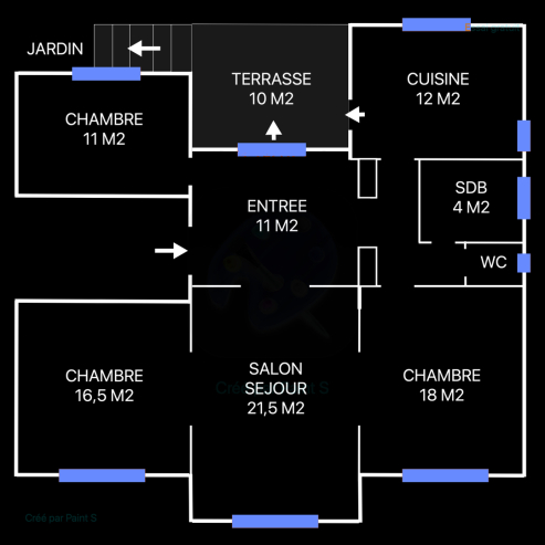 Il se compose d'une entrée avec accès terrasse et jardin, un salon séjour de 22 m2, trois chambres, une cuisine séparée, une salle de bains avec baignoire, lavabo et fenêtre, des wc séparés. Il dispose également d'un jardin privatif de 100 m2, d'une cave et d'un garage avec porte automatique.